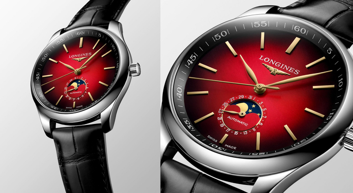 新作采用42毫米精钢表壳,搭配赤焰红色太阳纹表盘,渐变效果由中心向外延展,配以镀金时标与指针。表盘6时位置设有月相与日期显示功能,透过透明表背,可欣赏机芯内部金色摆陀上镌刻的徐悲鸿先生“奔马”图腾,以及“徐”字落款。腕表搭载浪琴表L899.5自动上链机芯,配备硅游丝,具备约72小时动力储存,并提升抗磁性能,表款搭配黑色鳄鱼皮表带及精钢折叠表扣。