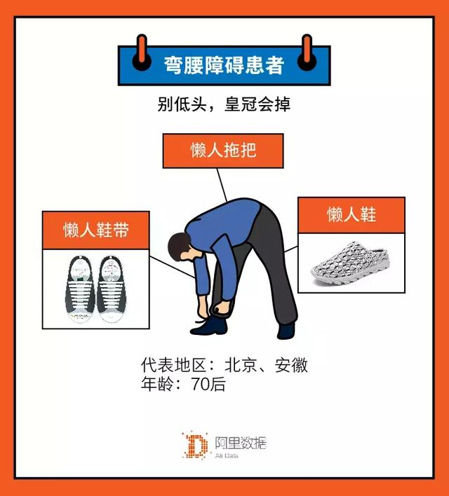 “弯腰障碍患者”,这个人群视弯腰为大敌,运用懒人神器避免弯腰系鞋带,弯腰拧拖把等动作。他们以70后为主,这类消费主要集中在北京和安徽。