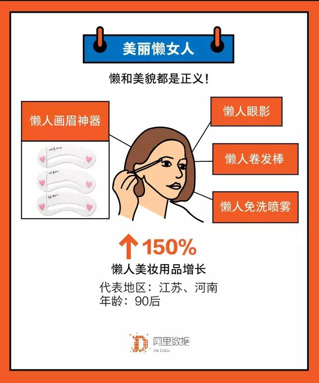 懒人甩脂机、懒人收腹机、办公室椭圆机等懒人运动器械教去年有51%的增幅,其中山东人消费最多懒人运动产品。而在懒人美妆产品方面,画眉神器、懒人卷发棒、懒人眼影、懒人面膜等美妆用品的增幅达到150%。以江苏、河南消费最为突出。