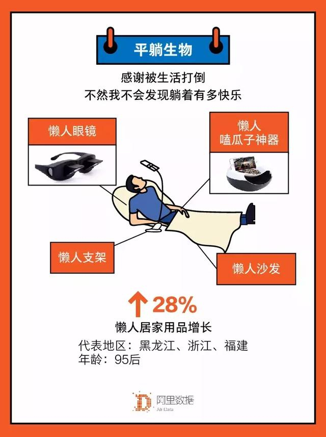 “平躺生物”,指的是借助懒人神器实现躺着也能有丰富多彩生活的人群。数据显示,淘宝懒人居家用品消费较去年增长了28%,他们以95后为主,主要分布在黑龙江、浙江和福建。