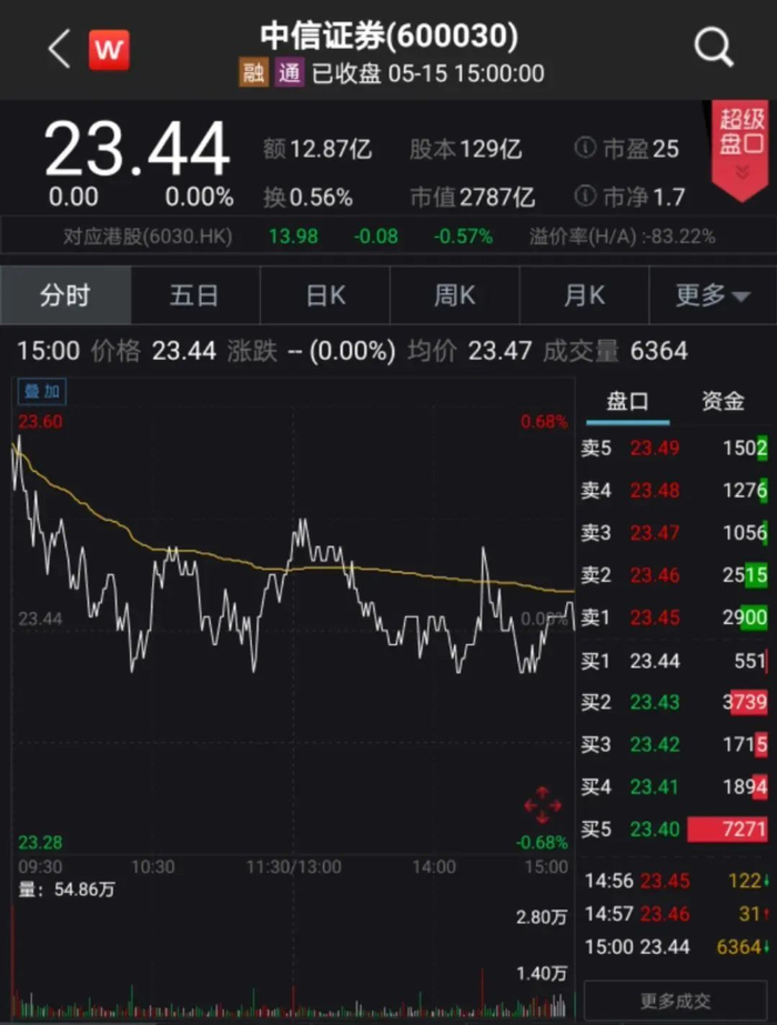 2019年营收431亿,净利润122亿,在亮眼的成绩护航下,中信证券继续稳坐“券商一哥”位置。截至5月15日收盘,中信证券股价报23.44元/股,总市值达3030亿元。