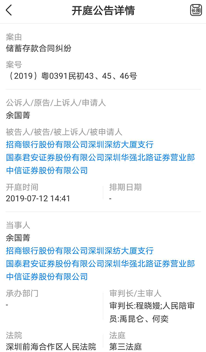 记者从天眼查查询到,2018年4月份以来,余国菁作为原告/上诉人,陆续与招商银行深圳深纺大厦支行、国泰君安证券深圳华强北路证券营业部、中信银行深圳深南支行、建设银行深圳八卦岭支行因存在储蓄合同纠纷开庭,前海合作区法院审理内容未予公开。