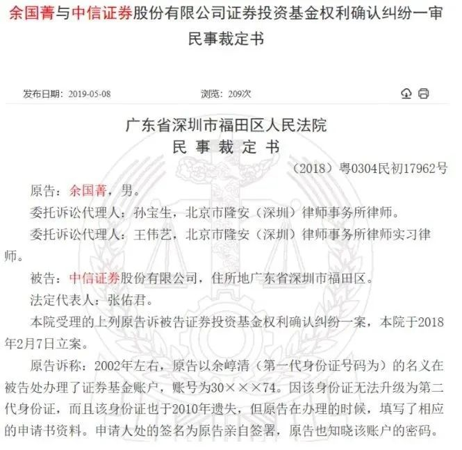裁判文书网信息显示,2018年4月6日,余国菁(时为台湾居民)与中信证券因证券投资基金权利确认纠纷案,被深圳市福田区人民法院进行一审裁决。