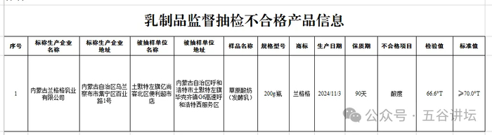 其中,内蒙古自治区呼和浩特市土默特左旗亿尚客北区便利超市店销售的、标称内蒙古兰格格乳业有限公司生产的草原酸奶(发酵乳)(2024/11/3、保质期:90天、兰格格、200g/瓶),其中酸度检验结果为66.6°T,标准规定为不得小于70.0°T,不符合食品安全国家标准规定。