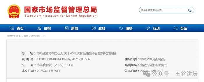 近日,市场监管总局办公厅发布了关于45批次食品抽检不合格情况的通报(市监食检发〔2025〕111号)。