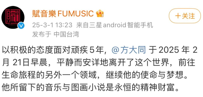 3月1日,方大同的独立音乐厂牌「赋音乐」突然发布讣告,让许多人震惊不已: