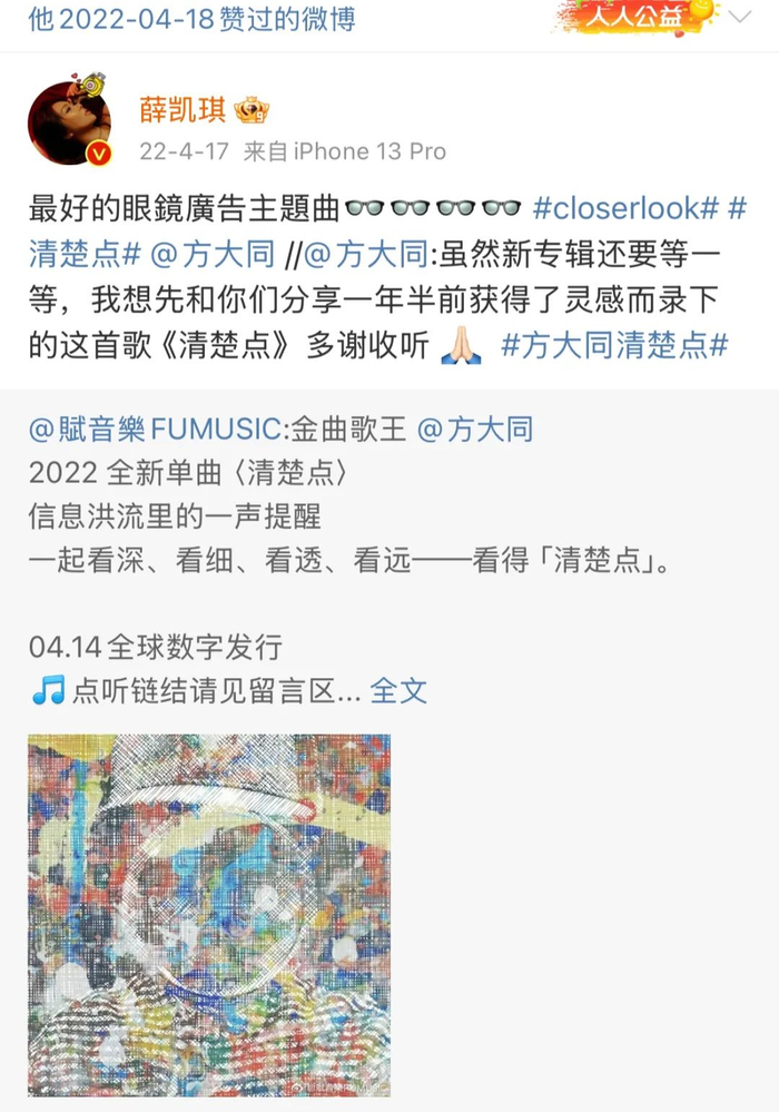 尽管近几年两人的互动少了很多,上一次还停留在2022年——薛凯琪为方大同的新歌助阵,他则点赞了这条转发。