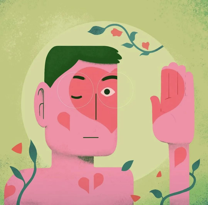 回看专辑封面,散落着被切割成两半的心。在绿意盎然的、彩色明亮的背影中,主人公挥手告别。