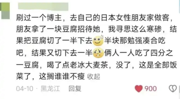 有网友去日本女性家坐客,招待他比招待苍蝇还简单,只给吃了四分之一块豆腐;