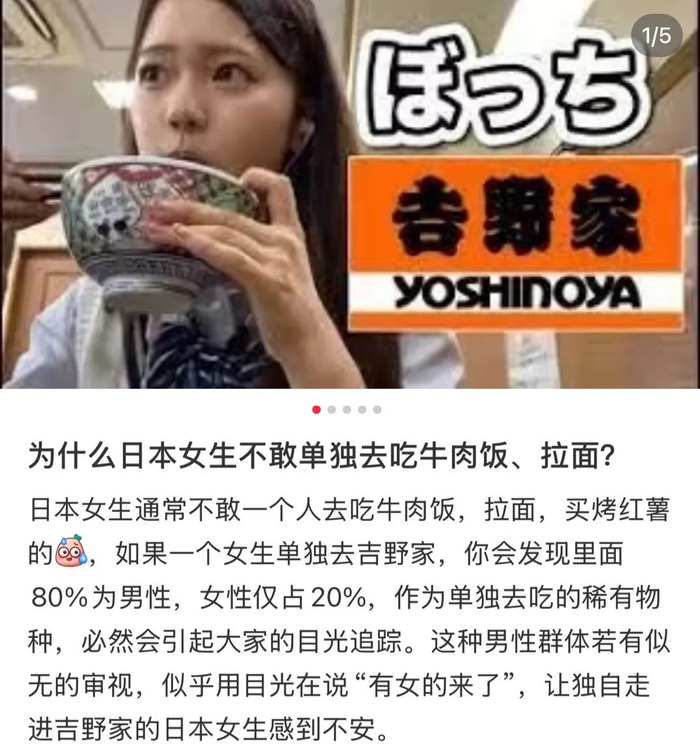 拉面和牛肉盖饭在日本,被认为是油腻、粗糙的食物,堂食就餐吃拉面和牛肉饭,绝对不符合日本女性精致的外表。