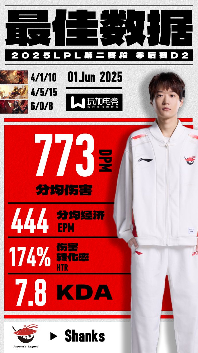 【#玩加数据# 2025LPL第二赛段季后赛DAY2最佳数据:@Shanks-15 】