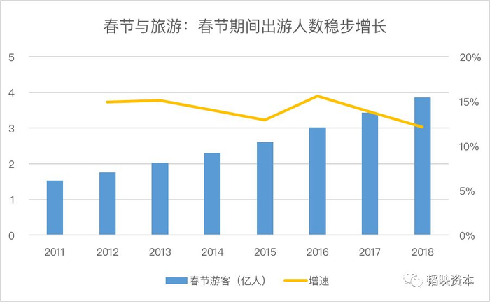 2011-2018年,春节期间国内接待游客数量从1.53亿大幅上涨150%至3.86亿。据携程预计,今年春节出游人数预计将超过4亿人次,北上赏雪和南下避寒成为主流选择。