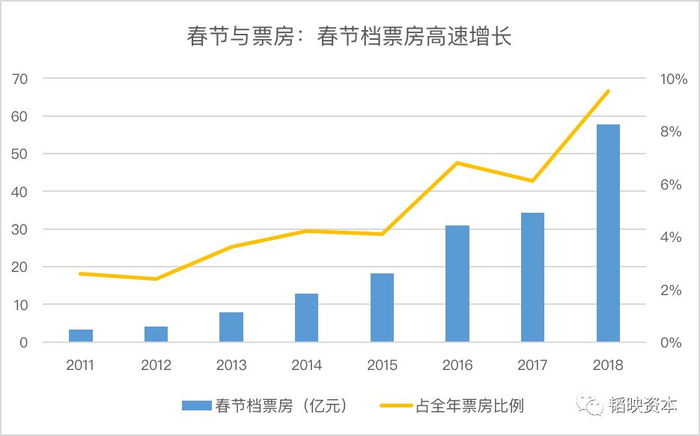 春节期间,难得一家人有钱有闲,聚在一起看个电影不失为一个好的选择。近年来,春节期间的电影票房保持高速增长,春节档也成为各大电影公司的必争之地。2011-2018年,春节档票房从3.4亿元一路上涨到57.7亿元,年度复合增长率高达50%,占全年票房比重从2.6%提升至9.5%。其中,头部影片的票房贡献率为80%左右。