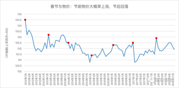 除了工业数据以外,房地产成交、进出口、物价等经济指标同样受到春节效应影响。以CPI为例,春节前期和春节期间,居民消费需求旺盛,物价通常会有所提高,CPI也会跟着提升;随着春节过去,物价又回归平稳。