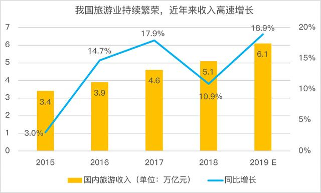 此外,旅游需求的增长也刺激着酒店行业的发展。近年来,我国旅游产业持续繁荣,根据文化与旅游部数据,2018 年国内旅游人数达 55.39 人次,近 10 年的年度复合增长率达 12.5%;国内旅游业收入达到 5.1 万亿,连续多年保持较高水平增长。