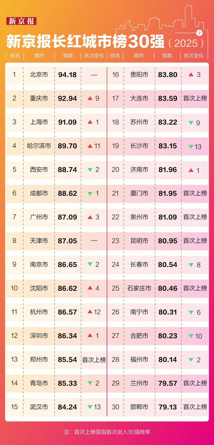 《新京报长红城市榜30强(2025)》聚焦2024年接待旅游人次超1亿的城市。在这些城市中,北京和重庆高居榜首,凭借的正是大量高质量的内容创作者和活跃的互动数据;哈尔滨、西安等城市则依托独特的文化和自然资源优势,打造了独具魅力的城市品牌。