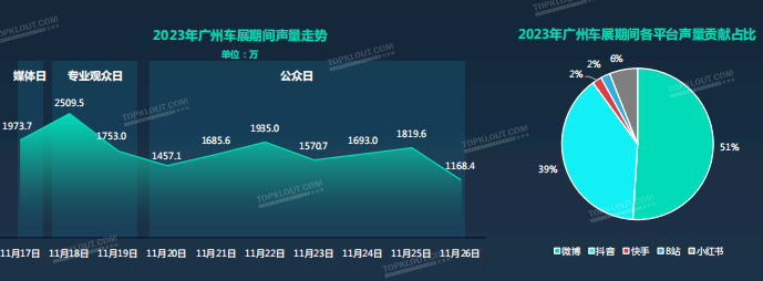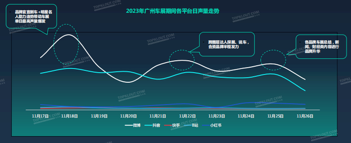 从时间线上看,车展初期,品牌扎堆官宣新车,新车发布与名人的助力,使得广州车展的声量持续升温,并在第一个专业观众日达到高峰。