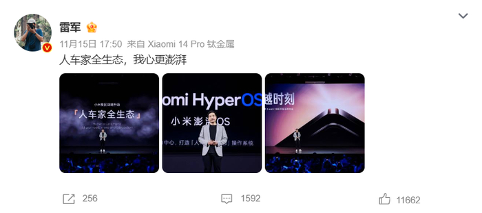 随后,小米汽车的图片被热转,雷军也发了一条微博——“人车家全生态,我心更澎湃。”