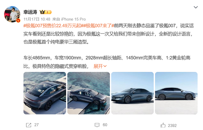 广州车展期间,极氪旗下全新纯电轿车极氪007声量主要源于微博,价格和颜值成为用户的关注重点。22.49万元起的预售价,和让人耳目一新的设计,使得极氪007车型在广州车展开启预售之后,48小时内订单量便超过了2万台,未上市即爆款。