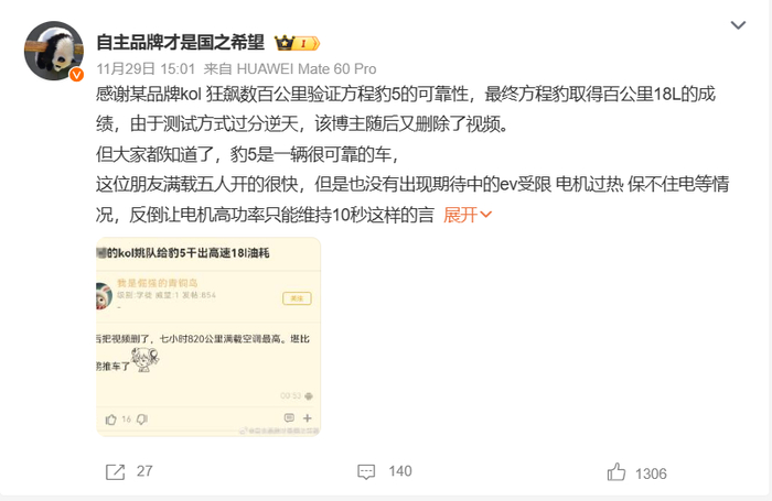 本届广州车展还有一个热度很高的新面孔——方程豹。作为比亚迪旗下混动越野车,抖音是豹5的声量主力平台,其汽车电池和底盘备受关注。
