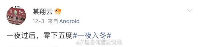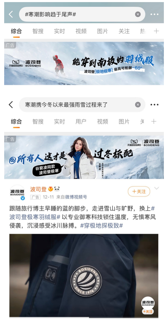 从去年冬季开始,波司登的身影就持续出现在#初雪#、#近期气温像弹簧#、#寒潮影响趋于尾声#等各类秋冬限定热搜之下,并根据话题所承载的迥异情绪,快速匹配与切换沟通素材,实现与每一个具体冬日场景的深度绑定。