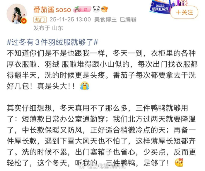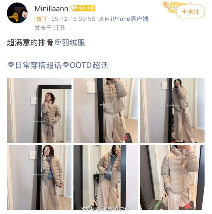 在#过冬有三件羽绒服就够了# 话题下,不少博主自发分享“冬日胶囊衣橱”理念:气场长款抵御寒风、灵活短款适配高腰裤优化比例、功能中层解锁层次美学。在他们的穿搭教程中,鸭鸭的羽绒服自然地作为“百搭单品”出现,搭配裙子、西装裤甚至瑜伽裤,示范其多功能性,悄然完成了从“保暖单品”到“穿搭利器”的心智植入。