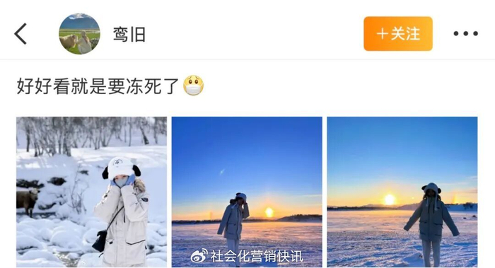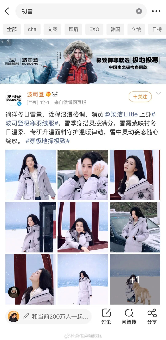 而当话题切换到#初雪#、#北京暴雪#、#北京初雪来了# 、#郑州的雪越来越大# 、#北京下雪#、#北京初雪故宫一步三个格格#、#你那里初雪发货了吗# 等话题,全网情绪被浪漫、唯美的“出片”需求主导时,波司登又迅速放出代言人梁洁在雪中的氛围感穿搭,将产品融入赏雪、玩雪的愉悦场景中。