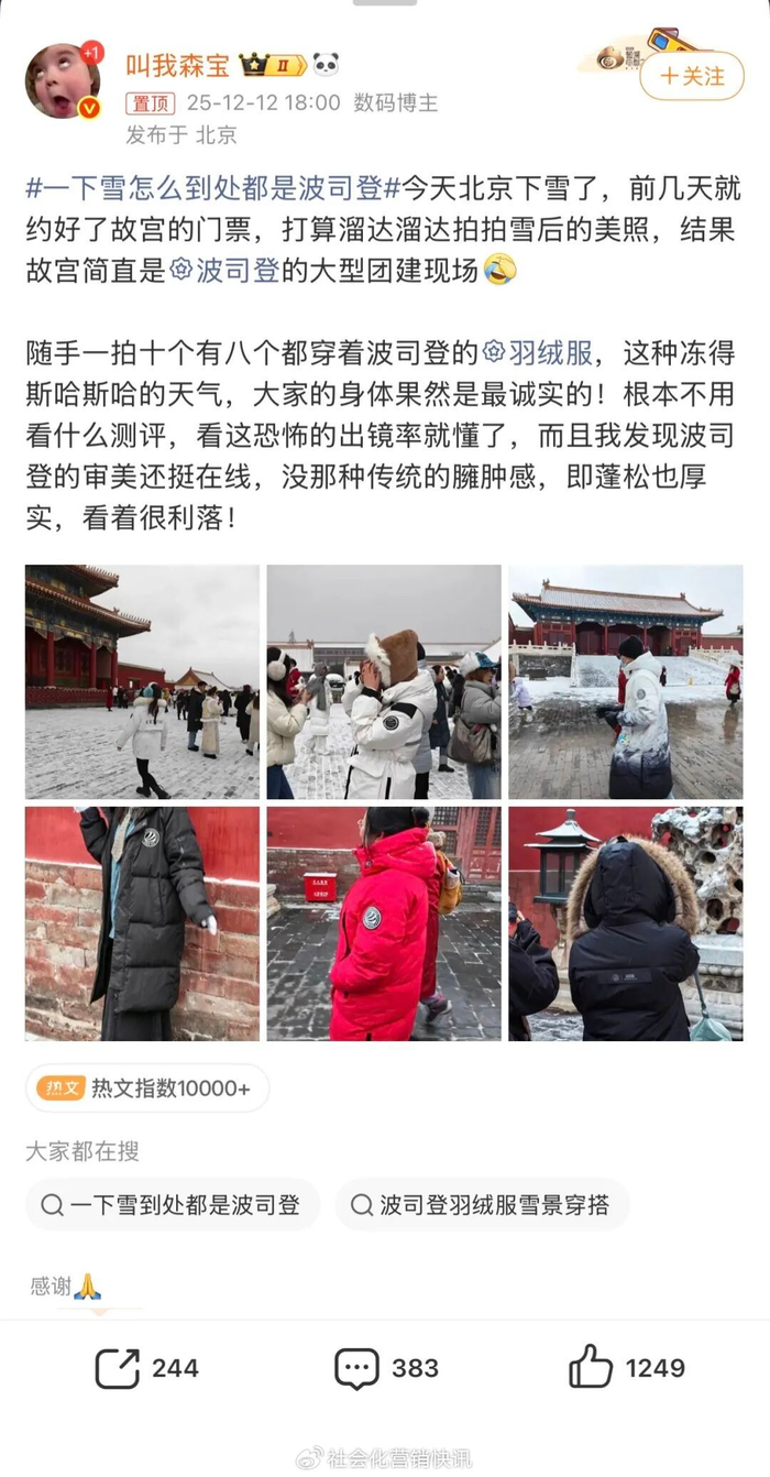 在人们讨论天气、分享季节、甚至抱怨寒冷的时刻出现,提供一种恰如其分的“解决方案”,这一过程中,波司登也随之从单纯的“卖羽绒服的”,变成了冬日生活的深度“参与者”和“陪伴者”,这也难怪网友们感叹#一下雪怎么到处都是波司登#。
