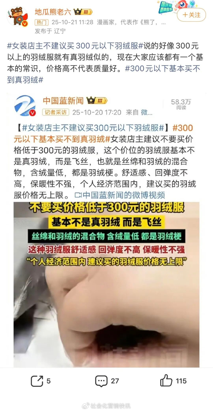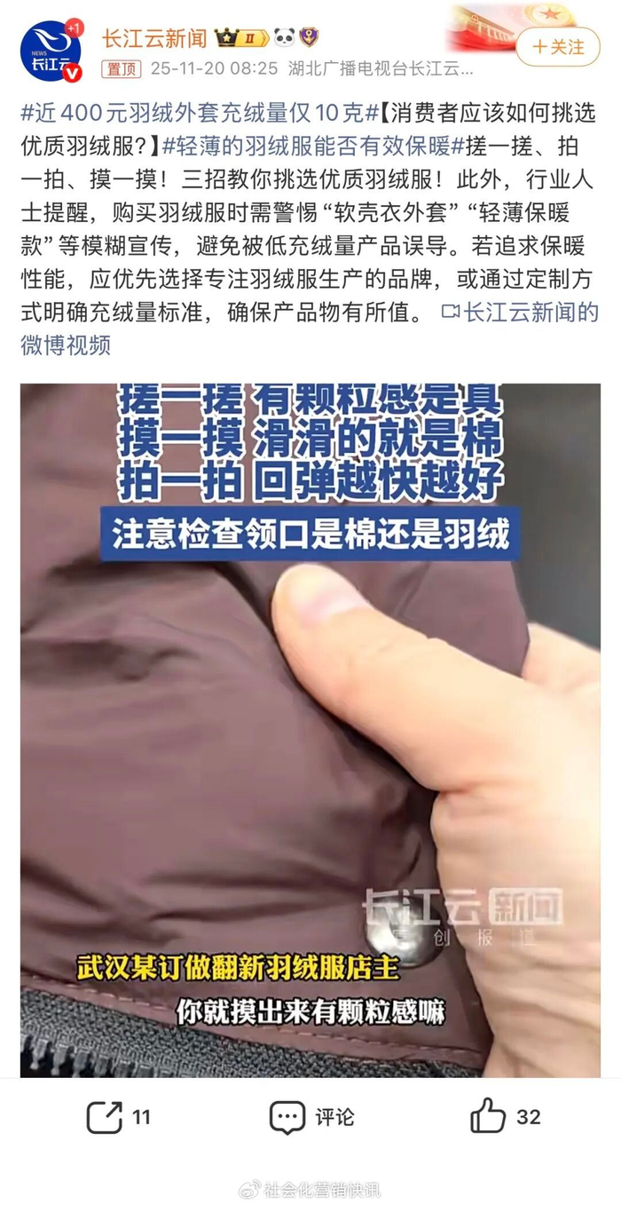 与时尚热度齐飞的,是关于羽绒服质量与价格的全民讨论。今年以来,#300元以下买不到真羽绒服# 、#7万件羽绒服查出含绒量为0#、#羽绒服涨价狂潮# 等多个相关话题接连登上热搜,共同将羽绒服推上了品质信任的风口浪尖。