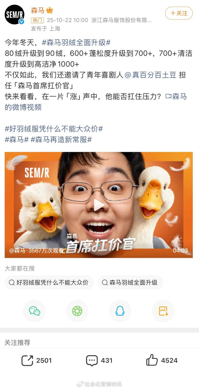 以森马为例,邀请喜剧人土豆担任“首席扛价官”,先以情绪共鸣化解价格敏感,在观众会心一笑之后,再顺势带出“产品全面升级至90绒、700+蓬松度”硬核信息,这种 “先谈情绪,再讲参数” 的沟通方式,既缓解了消费者的价格焦虑,也扎实地传递了品牌“只长脸,不涨价”的诚意。