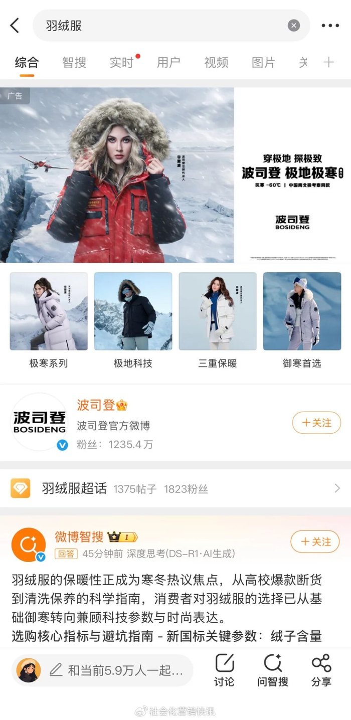 还有细心的网友发现,自己在发博和搜索羽绒服相关的内容时,还能看到带着特殊标记的“羽绒服”三个字,而顺着这个特殊标记点进去,可以进一步露出波司登的信息。这种更轻巧、更原生的方式,为网友在需求产生的当下,提供一种自然而然的承接,也让品牌深入到了更前端的消费决策环节。