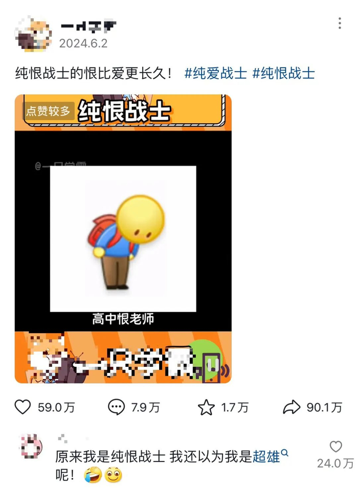 而纯恨战士与其意思相反,只有恨,且恨比爱更长久。现在延伸成各种恨,比如上班恨老板,出行恨司机,美发恨tony、就餐恨厨师……只有人想不到,没有这部分人恨不到的,可谓干一行恨一行,三百六十行,行行出仇人。