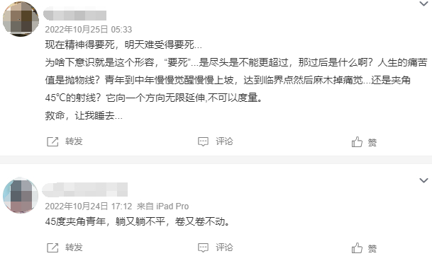 意思是无法躺平,拼搏又只有三分钟热度,在躺平与奋起拼搏中反复横跳,卡在中间呈现出了一个45°角,难受又纠结。