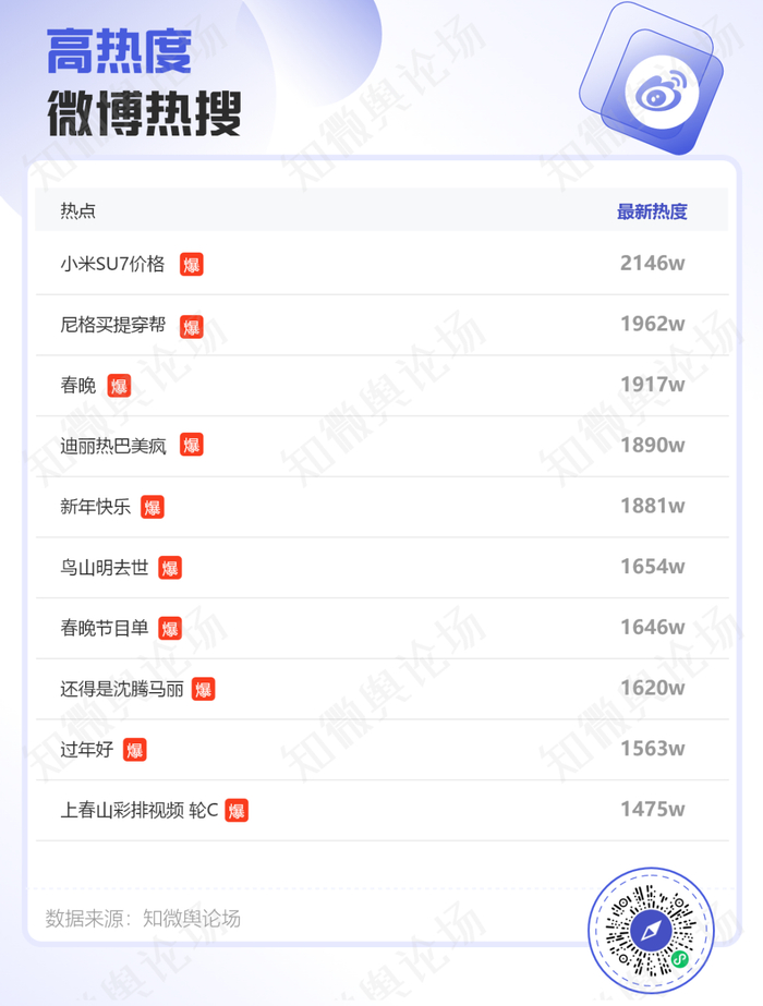 第一季度热搜“爆”词86个,以娱乐热点为主,其中春晚相关词条14个,“小米SU7价格”热度最高。