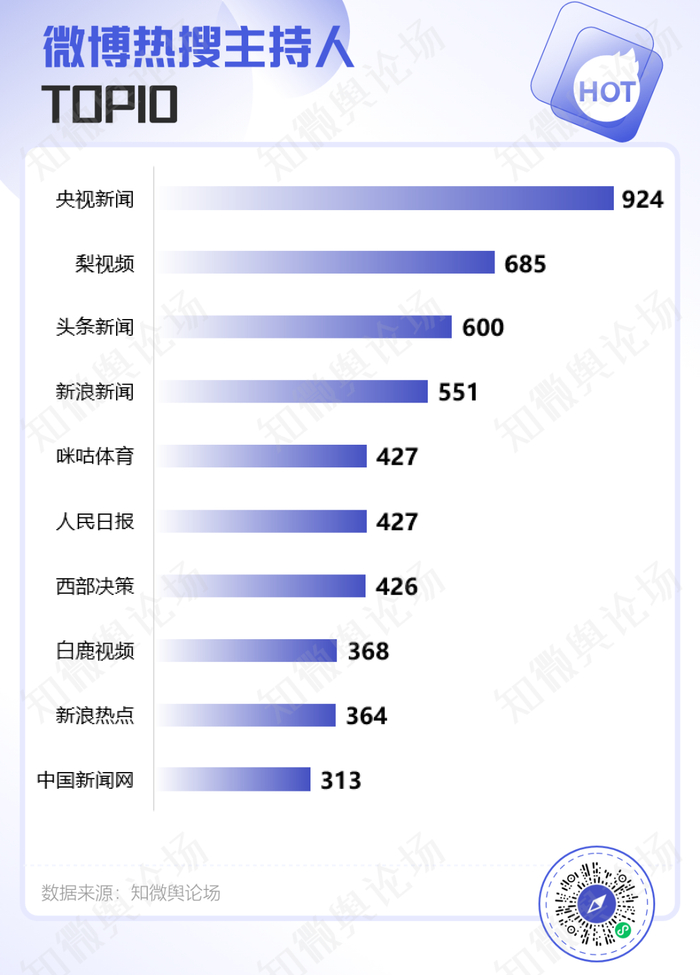 85%以上的热搜话题有主持人,央视新闻活跃在热搜第一线,参与主持900+热搜话题。