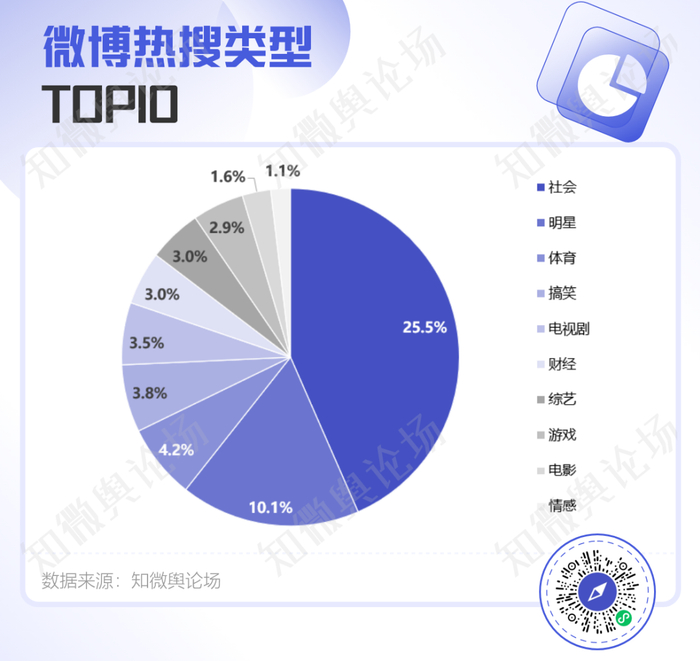 社会类热点为热搜常客,占比25.5%,其次为明星、体育类内容。