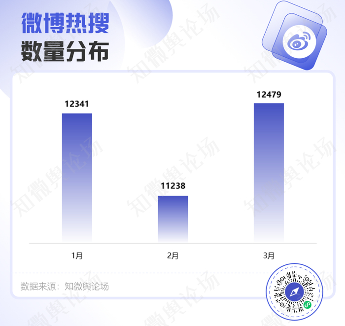 第一季度上榜热搜3.6w条,平均每月上榜热搜1.2w条,同比增加15%。其中,2月受春节假期影响,整体热搜量较少。