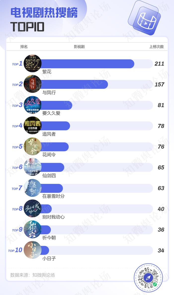 电视剧相关内容中,电视剧《繁花》广受关注,上榜热搜200+,成为第一季度的热剧;其次为《与凤行》,上榜热搜157次。