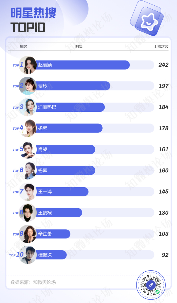 明星热搜中,赵丽颖上榜热搜242次,位居第一。
