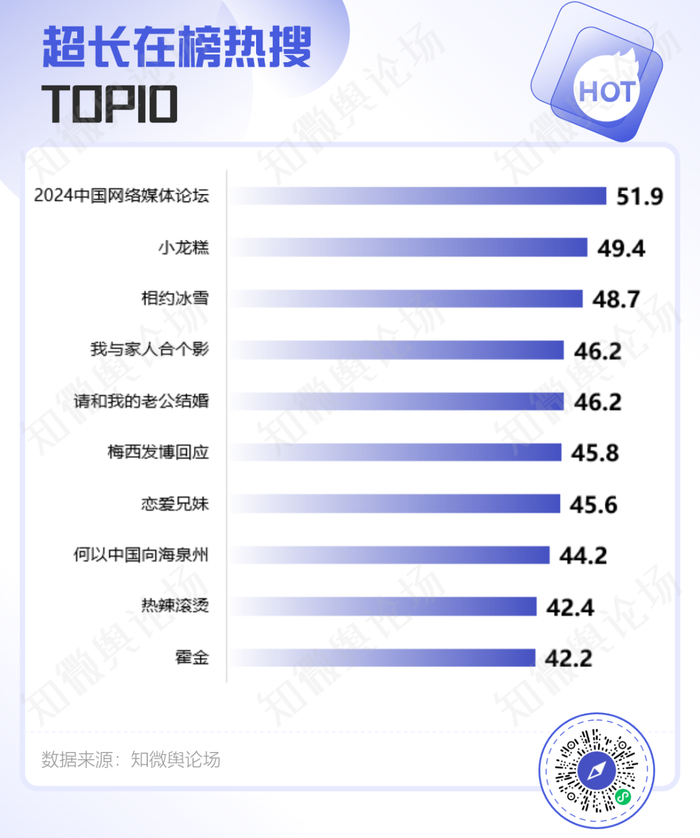 在榜时长>24小时的“超长在榜”热搜31条,其中“2024中国网络媒体论坛”在榜时长51.9h,位居第一。