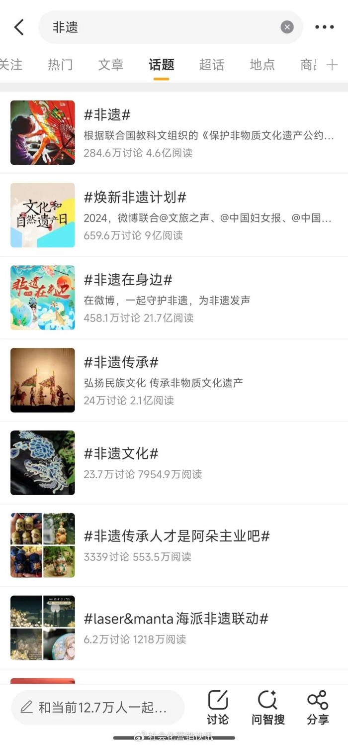 社交平台上,非遗话题持续升温,仅微博一个平台就有#非遗#、#焕新非遗计划#、#非遗在身边#、#非遗传承# 等多个浏览量过亿的话题。