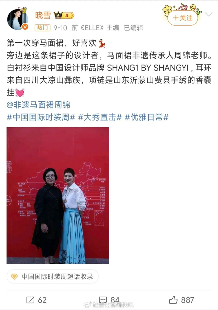前《ELLE》主编@晓雪 晒出周锦设计的马面裙
