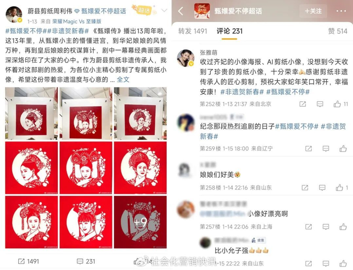 与此同时,话题#非遗传承人为甄嬛传小主剪小像# 也冲上热搜,让剪纸艺术借《甄嬛传》IP之力完成文化破圈。