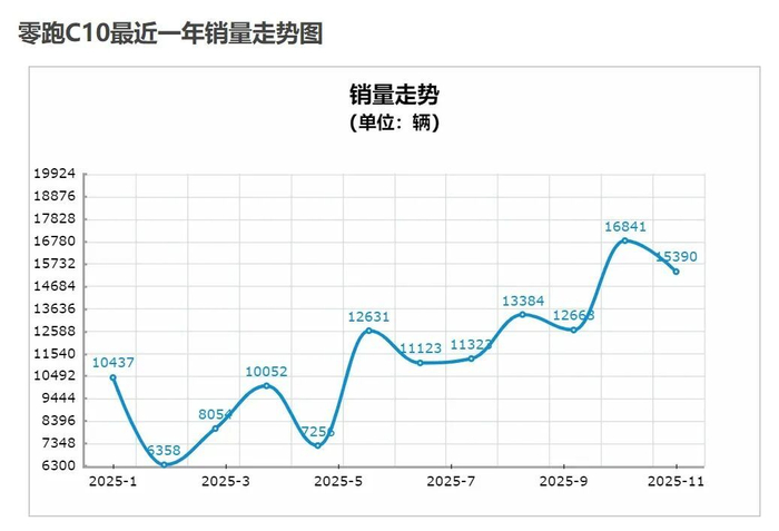 而零跑C10作为一款新势力品牌推出的车型,攻势同样迅猛。数据显示,自2024年3月上市以来销量呈现出迅猛的增长势头,截至2025年11月累计销量已突破20万辆,尤其是2026款车型上市后已连续7个月销量破万,稳居新势力销量榜首,证明了其产品策略的成功。