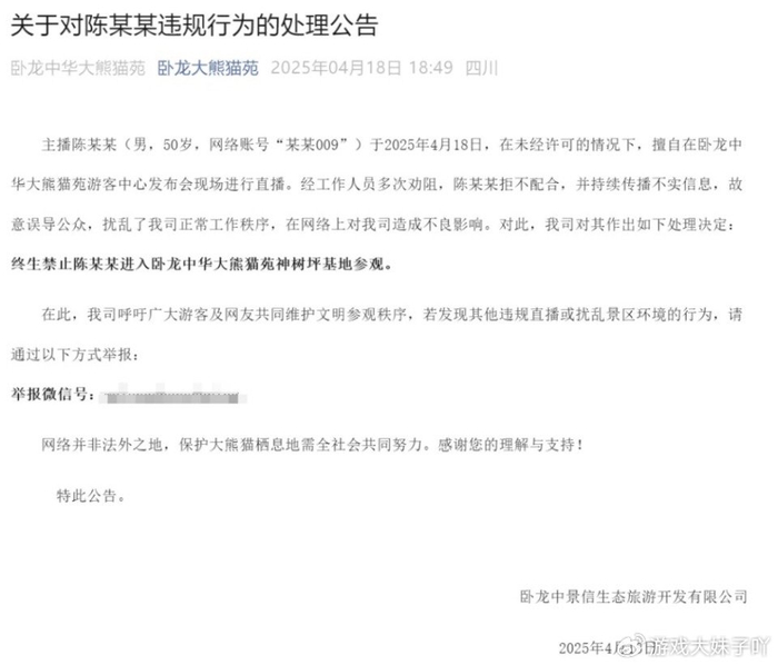 主播为流量违反规定,四川卧龙中华大熊猫苑宣布,该主播终生禁入园区,近日,四川卧龙中华大熊猫苑发布了一则处理通告,引发了社会广泛关注。公告中指出,一位名为“某某009”的50岁男主播陈某某,在未经许可的情况下,于2025年4月18日擅自在熊猫苑游客中心举行活动期间进行直播,更令人震惊的是,在工作人员多次劝阻下,他不仅拒不配合,还传播不实信息、故意误导公众,扰乱正常秩序,最终被园方宣布终身禁止进入神树坪基地,这一事件无疑为当前的网络直播生态敲响了警钟。