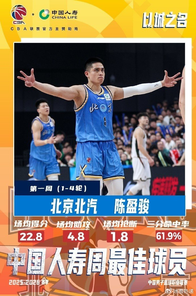 陈盈骏收获加盟北京男篮后的首次本土周最佳荣誉,也是CBA生涯第4次,前3次均是效力广州男篮时期。