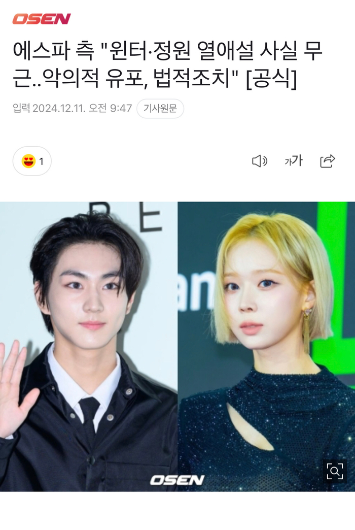 此前,有人爆料了金玟庭和梁祯元恋情,现在SM否认了,并称将采取法律措施应对谣言。