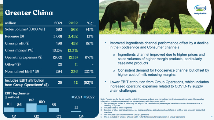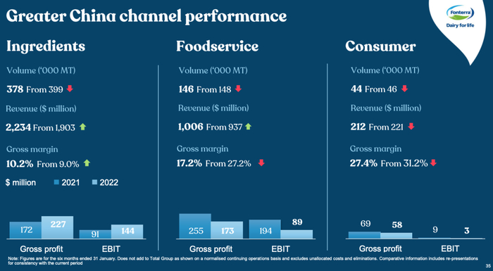 小食代翻阅的业绩会演示资料显示,2022财年上半年,恒天然大中华区的收入为34.52亿新西兰元(约合人民币149.87亿元),同比增长13%;调整后息税前利润(EBIT)为2.36 亿新西兰元(约合人民币10.25亿元),同比下降20%。