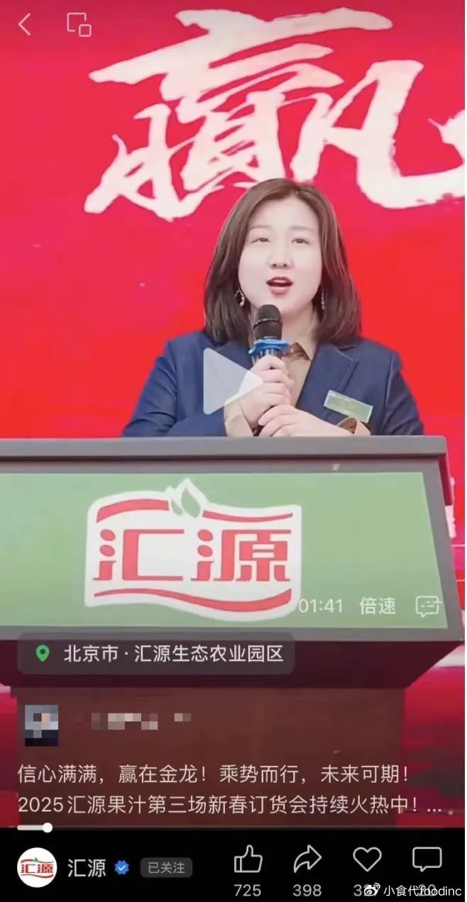 小食代留意到,不久前汇源果汁举办了2025年春节订货会,会上汇源果汁董事长鞠新艳发表讲话后,名为朱琳的女士亮相并讲话。一位接近汇源果汁的人士向小食代确认,朱琳正是汇源果汁新任执行总裁。