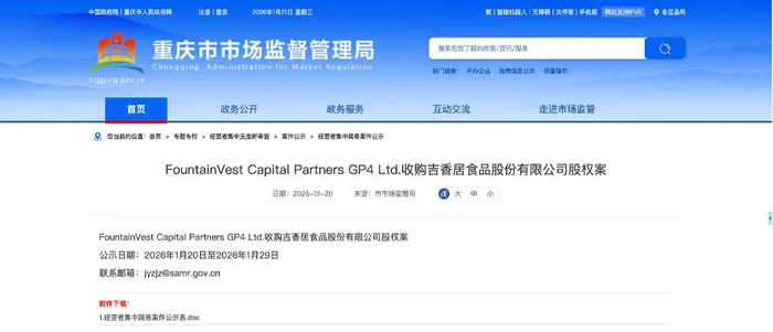 日前,小食代从重庆市市场监督管理局官网获悉,FountainVest Capital Partners GP4 Ltd.(下称“方源GP4公司”,为方源资本的实体之一)收购吉香居食品股份有限公司(下称“吉香居”)股权案正在进行经营者集中简易案件公示。如果交易顺利完成,方源资本将持有吉香居92%股份。该案的公示期到2026年1月29日结束。